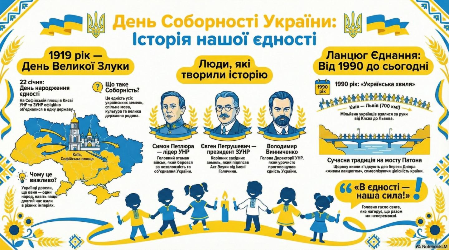 - Злуку двох частин України в одну Українську державу – Акт Злуки – проголошено 22 січня 1919 року.