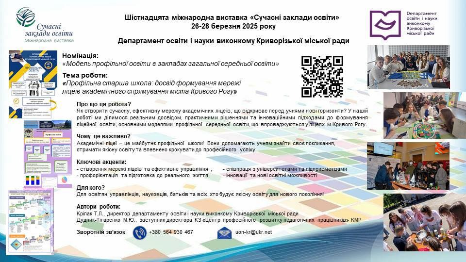 Окремо відзначу роботу, підготовлену Департаментом освіти і науки міста, у номінації «Модель профільної освіти в закладі загальної середньої освіти». Проєкт «Профільна старша школа: досвід формування мережі ліцеїв академічного спрямування міста Кривого Рогу» здобув золоту медаль та почесний диплом.