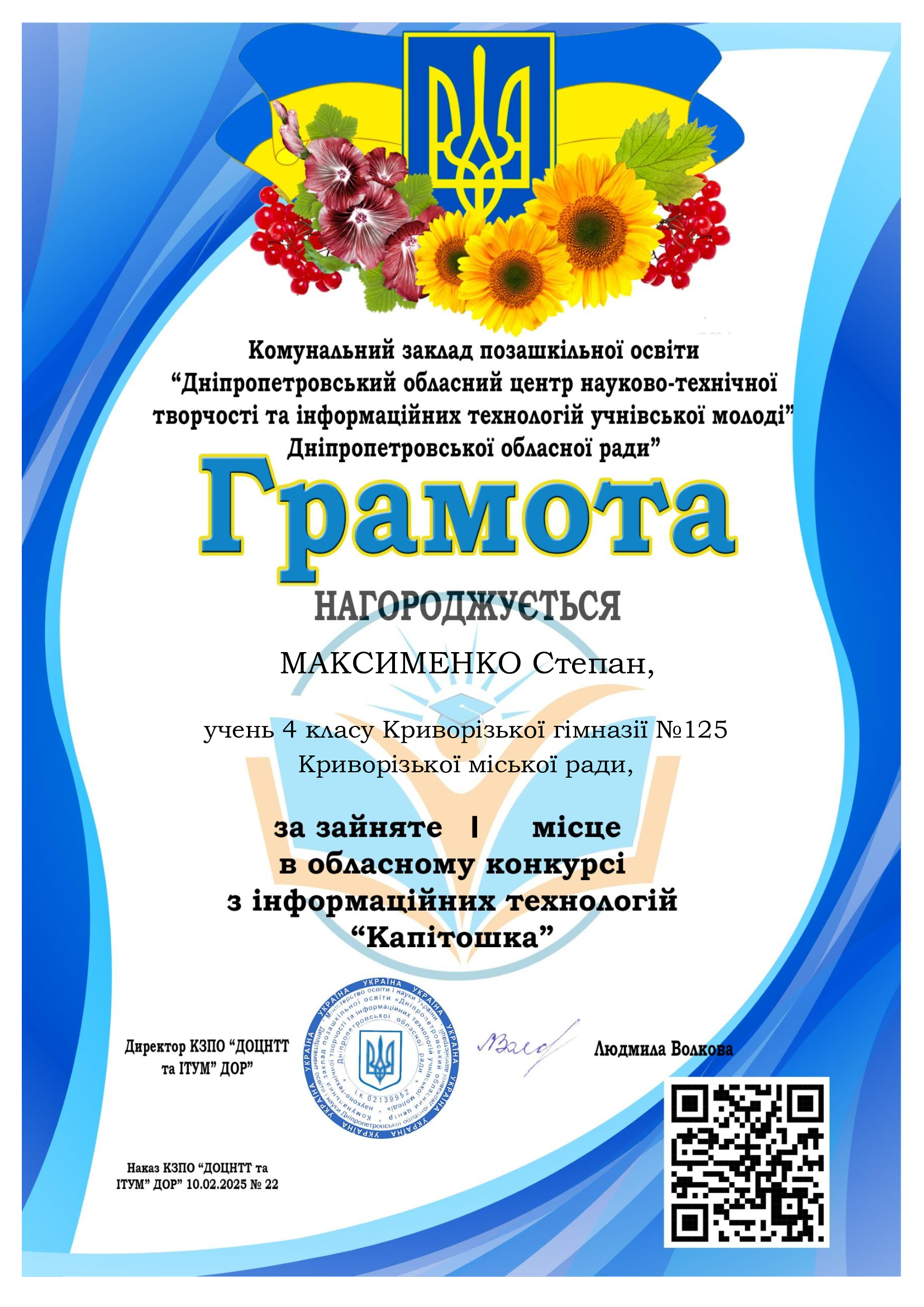 Конкурс "Капітошка", учень 4-А класу Максименко Степан - 1 місце