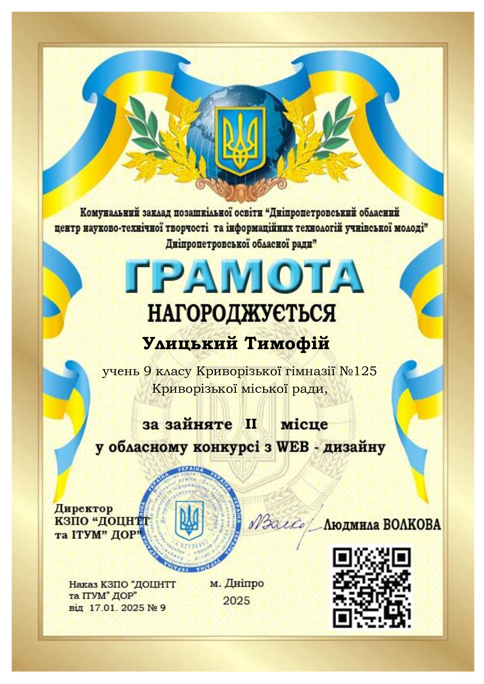 Конкурс "Веб дизайн", учень 9-Б класу Улицький Тимофій - 2 місце