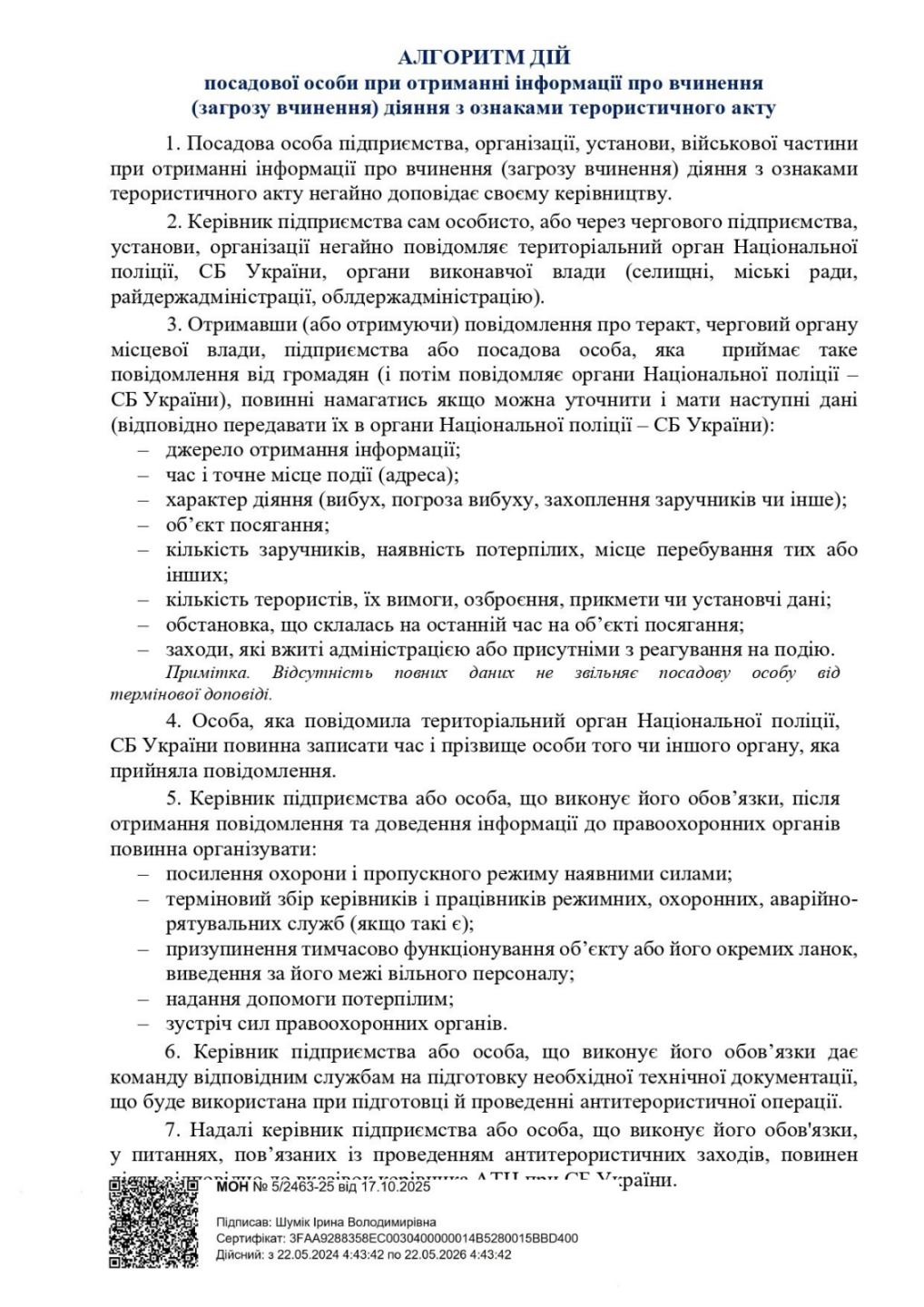-алгоритм дій посадової особи при отриманні інформації про вчинення (загрозу вчинення) діяння з ознаками терористичного акту;