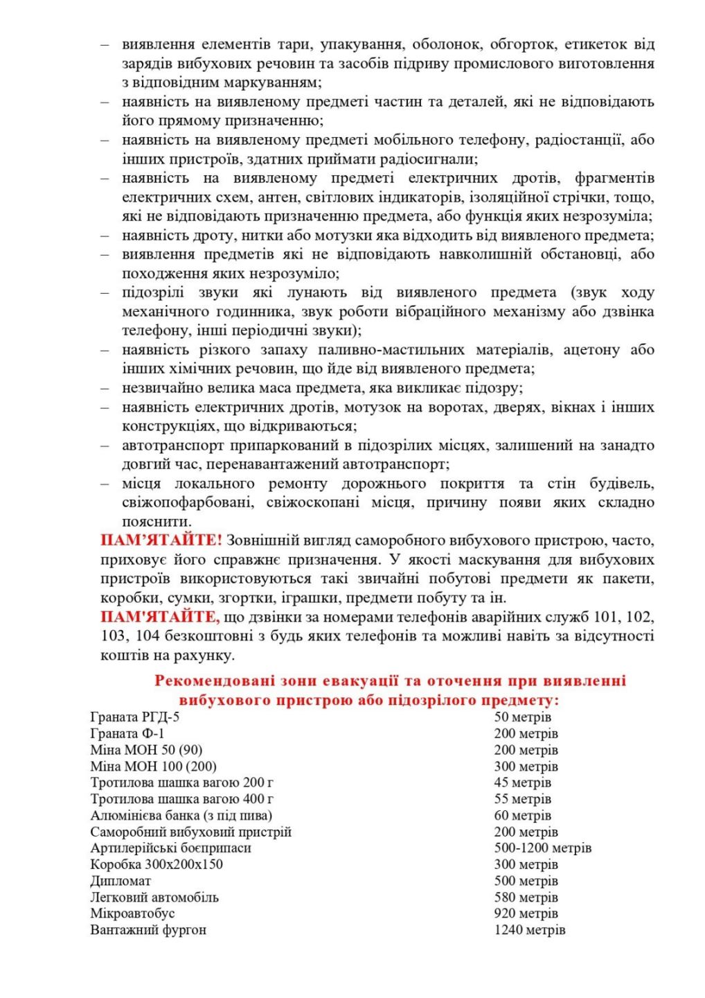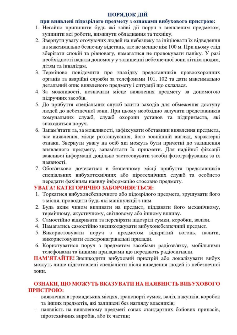 -порядок дій при виявленні підозрілого предмету, з ознаками вибухового пристрою;