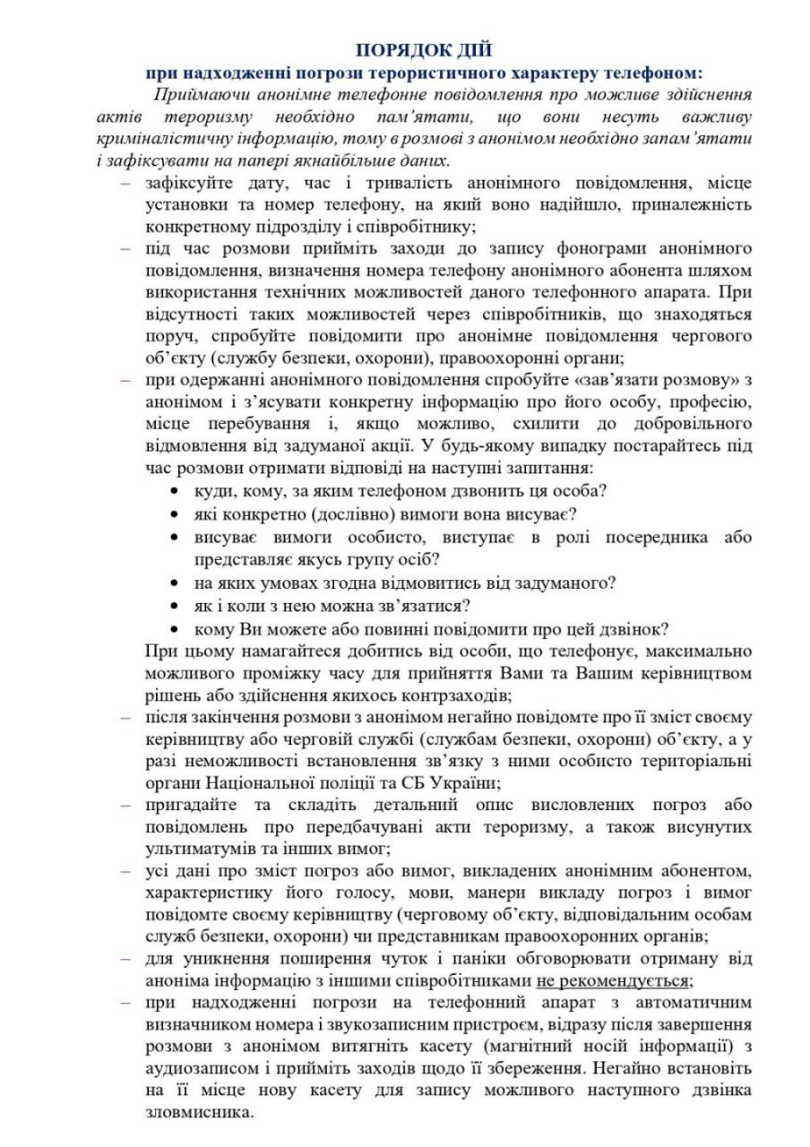 -порядок дій при надходженні погрози терористичного характеру за телефоном;