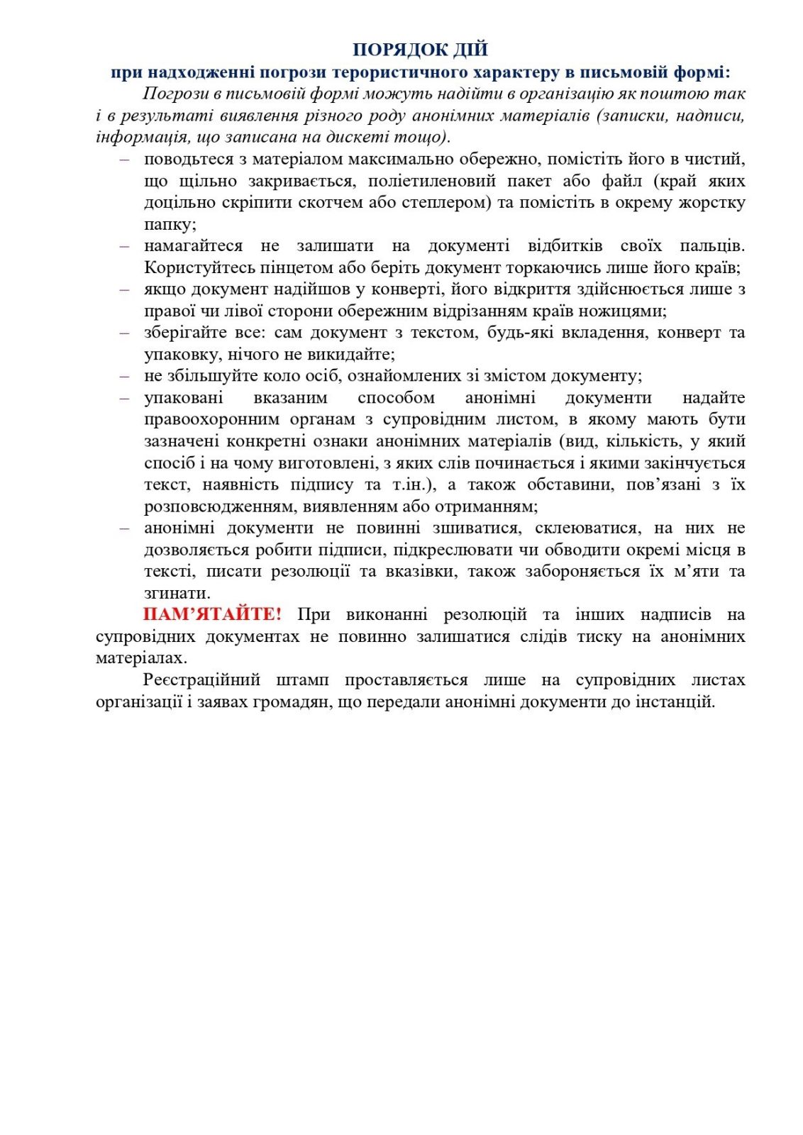 -порядок дій при надходженні погрози терористичного характеру в письмовій формі;