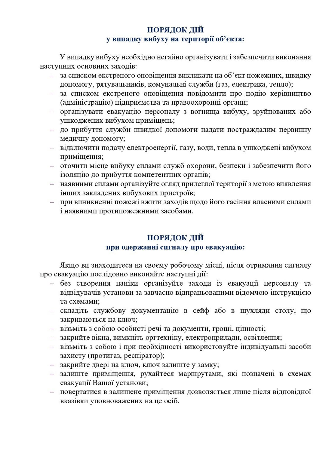 -порядок дій у випадку вибуху на території об’єкта;