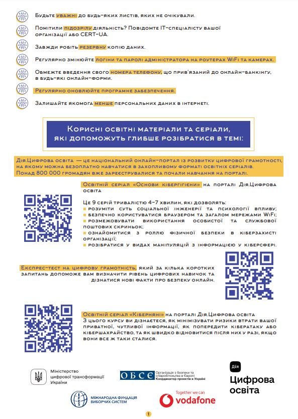 Інформаційну пам’ятку про кібергігігєну на робочому місці – https://osvita.diia.gov.ua/tips-for-cybersecurity;