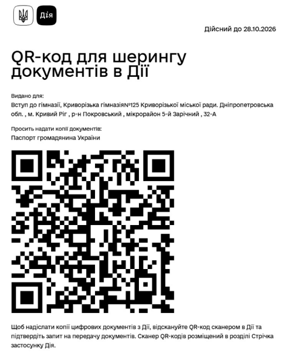 У нашій гімназії в 2025-2026 н.р. навчається 792 учня (Ліцензований обсяг - 1640 осіб). Якщо Ви бажаєте вступити до нашої гімназії, то ви можете зареєструватися на сайті електронної реєстрації в заклади загальної середньої освіти https://school.isuo.org та здати документи, перейшовши за QR кодом для шерингу документів у Дії